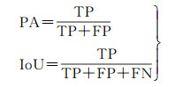 利用像素准确率(PA)、交并比(IoU)评价深度学习自动提取结果,计算公式为