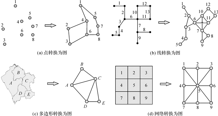| 图 1 将点、线、多边形及网格等空间表达转换成网络图结构表达 Fig. 1 Using network (graph) structure to express spatial structure (e.g., point, polyline, polygon, and grid) |