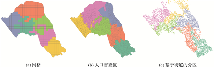 在制定PDP时,第一步是选择可以合并的基本单元。大多数PDP模型使用区域单位或格网作为基本单位[40-41],如图 10(a)、(b)所示。开发基于街道的PDP模型能够获得更优的方案,原因如下:①街道网络的特征既影响长期犯罪模式,也影响犯罪行为的短期动态,这表明街道一级预防犯罪的重要性。②由于街道网络从根本上影响警察的行动,基于网络的模型将产生更好的可用性的分区计划。由于方形网格或人口普查区可能与物理障碍相交并包含未连接的街道段,因此街道比它们更适合运营部署。③由于街道是人类运动和空间认知的基本要素,基于街道的分区解决方案能够减轻基于网格的模型中固有的可变区域单元问题(MAUP)的影响。因此,文献[42—43]提出了基于城市街道网络的警察巡逻区划分方法,如图 10(c)所示。其能设计高效且平衡的警察巡逻区和在线实时优化巡逻路线,并能减少20%紧急事件应急反应时间,使得警员可以有更多的时间在犯罪热点路段上巡逻。该方法可以扩展应用到大型车队的物流调配。