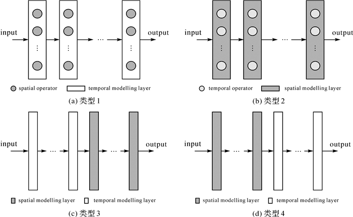 早期开发的深度学习模型通常用于预测基于网格表示的时空数据,这是因为这些深度学习模型使用卷积神经网络(CNN)来捕获空间依赖性,而CNN只能在规则网格化的空间域上工作。然而,在交通、传感器、能源和社交网络等应用中,时空数据自然地存在于网络空间中,网络能既精准又实用地表达时空数据,同时基于图的深度学习也能被用于模型建模,并且广泛适用于密集的和稀疏的时空数据。为了对时空数据的时空相关性进行建模,一种直接且有效的方法是将空间和时间建模组件集成到深度学习模型中, 可以归纳为4种主要类型(图 3)[22]:①将空间算子集成到时间建模结构。一个典型的例子是ConvLSTM[23],它本质上是一个循环层(如LSTM),但是内部的矩阵乘法被卷积运算所取代。它可以通过非线性和卷积结构学习数据集中复杂的时空模式。②将空间算子集成到时间建模结构。这种类型的混合深度学习方法将循环机制集成到空间建模深度学习结构中,如循环CNN(RCNN)将循环连接合并到每个卷积层中[24]。③先时间建模,后空间建模。例如,LSTM-CNN架构通过利用LSTM从其输入序列中查找长关系并通过卷积操作提取局部和密集特征,非常适用于人脸反诈骗[25]。④先空间建模,后时间建模。这一方式通过顺序连接空间和时间深度学习结构以进行时空信息学习。例如,CNN-LSTM结构的组合已被用于智慧城市中PM2.5预测[26]和交通预测[27]。