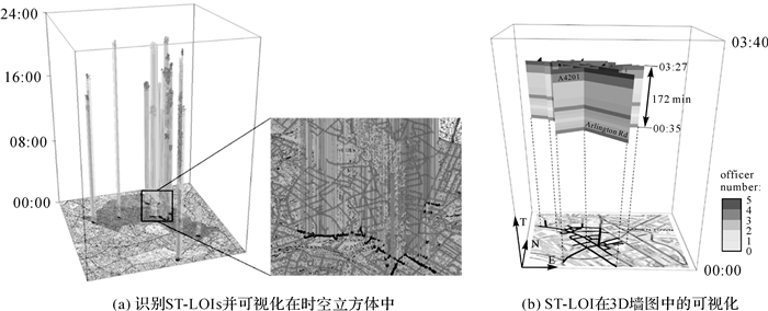 文献[42]开发了一种基于网络的ROI检测方法,命名为ST-LOI[37]。这一方法将时空聚类从笛卡尔空间扩展到基于网络的空间,并且无缝考虑空间和时间维度(图 9)。基于网络的时空热点的空间范围比空间凸包(图 8)的范围精准,更利于结合有具体坐标的兴趣点(point of interests, POIs)及其语义信息,对活动热点类型进行标示,以便于对人群的活动行为画像聚类。