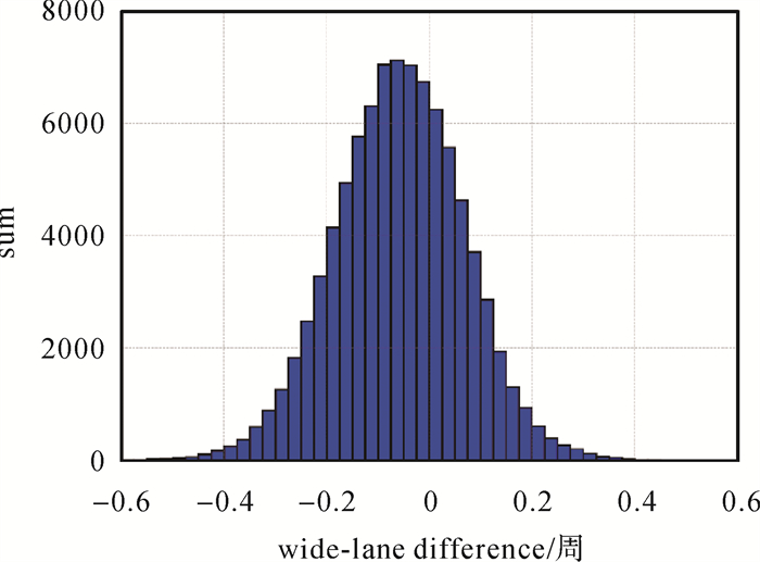 目前,IGS分析中心CNES/CLS提供整数相位钟与天解宽巷模糊度偏差产品用于模糊度固定,其中,各卫星的宽巷模糊度偏差保存在CNES/CLS钟差产品的头文件中。与本文提供的天内时变宽巷模糊度偏差序列不同,CNES/CLS将该偏差项作为天常数,即单天内为每颗卫星提供单个偏差改正[13]。为客观分析钟差解耦模型估计的宽巷模糊度偏差精度,本试验以CNES/CLS的产品为标准进行对比分析。二次差分(G01为参考星)并移除整周模糊度后的互差值如图 9所示。由于观测噪声的影响,各差值序列均围绕0附近波动。统计其平均差值约为-0.058周。统计图 9中各卫星二次差分时间序列(共计89 280个样本)得到图 10,以分析其互差分布情况。由图 10可知,宽巷模糊度互差值总体而言满足期望为-0.058周的正态分布,并且大部分互差值分布在±0.2周之内。与现有研究结论相比,该互差值略大,究其原因,一方面是因为钟差解耦模型无须将宽巷模糊度逐历元平滑,没有破坏其固有的时变特性,另一方面,将宽巷模糊度偏差建模为白噪声参数进行逐历元参数估计,也是造成其与CNES/CLS产品互差值较大的原因。