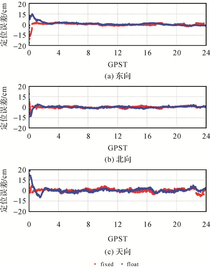 为了验证解耦钟差产品实际定位效果,对图 1所示所有用户站7 d的观测数据进行定位分析,获得模糊度固定解(fixed),同时使用IGS最终钟差产品进行定位测试获得模糊度浮点解(float)。IGS周解坐标文件作为真值比较和评估两种定位方式的定位精度。为了直观比较两种定位方式的误差情况,图 11展示了SASK测站模糊度固定解与浮点解的定位误差对比。当模糊度固定成功后,定位误差迅速到达0附近。在浮点解收敛后,其与固定解的定位精度较为接近。