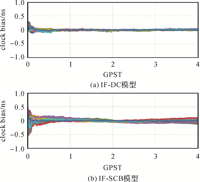 1 数学模型与分析方法本节主要从消电离层组合观测值出发,分别导出传统消电离层模型和钟差解耦模型,分析两种模型钟差的重构差异,在文献[26]的基础上重新梳理导出提取卫星码偏差(satellite code bias,SCB)的钟差估计模型,深入分析和研究钟差解耦模型在钟差估计收敛速度方面的优势。