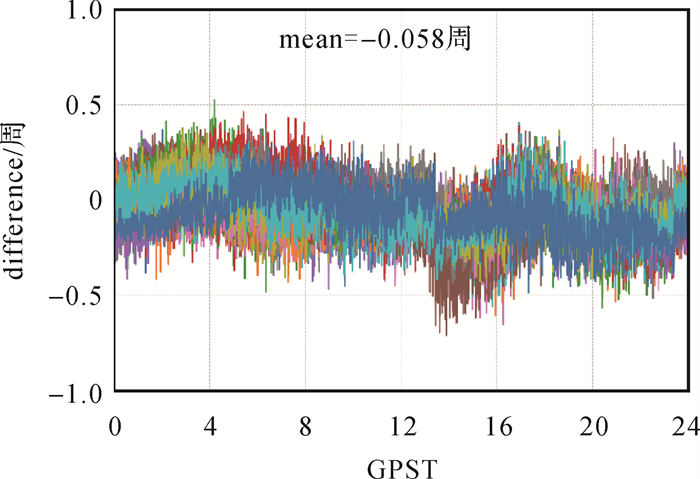 钟差解耦模型将宽巷模糊度偏差作为时变参数,并将其作为白噪声参数估计,因此,可以分析单天内宽巷模糊度偏差的时变特性。2021年DOY 031所有卫星的宽巷模糊度偏差估值如图 8所示。为减小刻度范围,便于观察其稳定性,所有偏差序列均被偏移整数周以将其限制在0~10周范围内。由图 8可以看出,各卫星的宽巷模糊度偏差估值序列在天内表现出明显的噪声特性,这是因为在服务端网解中该偏差项被建模为白噪声参数所致。但是对于每颗卫星而言,它们的宽巷模糊度偏差估值均围绕某一常数波动,这说明卫星的宽巷模糊度偏差在天内是稳定的。