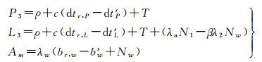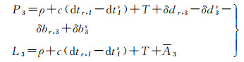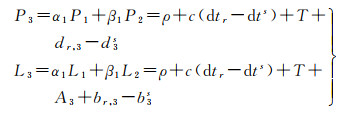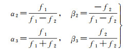 式中,P1、P2和L1、L2分别表示各频率原始伪距及相位观测值,单位为m;P3和L3分别表示消电离层伪距和相位观测值;ρ表示站星距;c表示光在真空中的传播速度;dtr和dts分别表示接收机钟差和卫星钟差;T表示斜向对流层延迟;A3表示消电离层后的模糊度,单位为m;dr, 3和d3s分别表示消电离层接收机和卫星码偏差;br, 3和b3s分别表示消电离层接收机和卫星相位偏差。假设其他误差已经改正,并且为了形式简化,观测噪声等误差在此忽略。另外,定义频率为f1和f2,式(1)中其他参数表示为