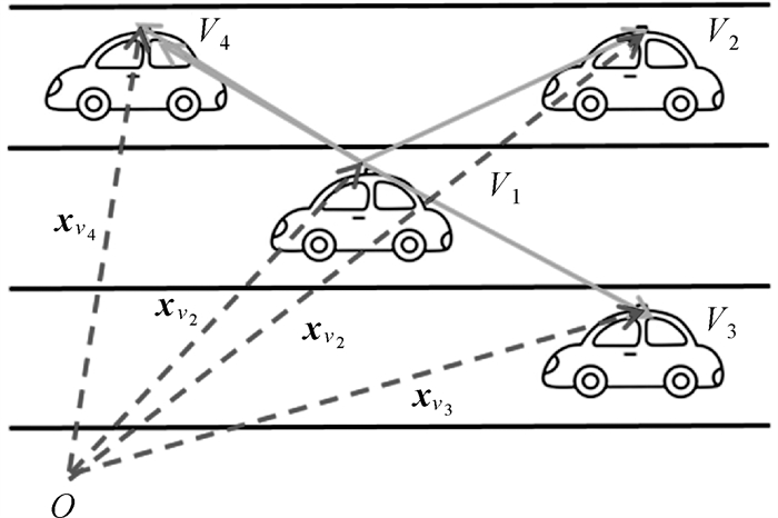 本文以4辆车的情形为例阐述多车协同定位方法,多车之间的协同定位原理类似,如图 2所示。
