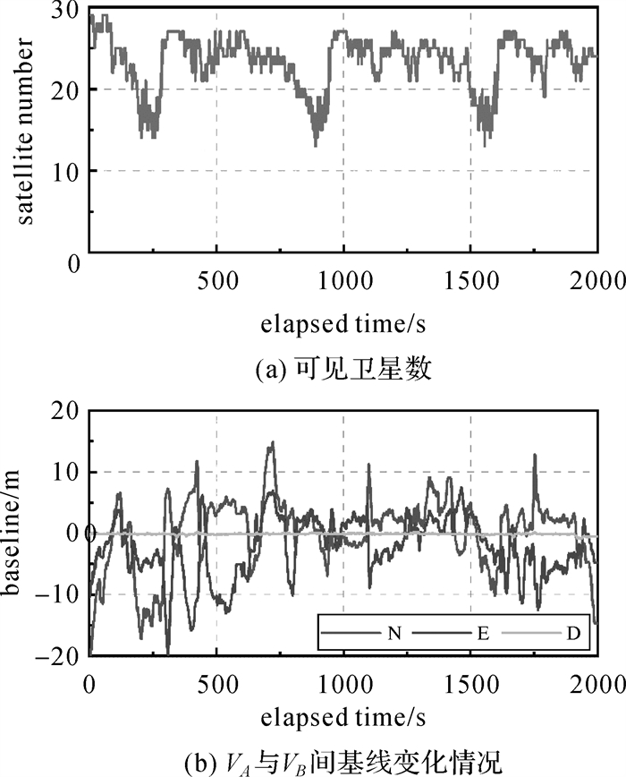| 图 4 可见卫星数及VA和VB间基线变化情况 Fig. 4 The number of visible satellites and the baseline between VA and VB |