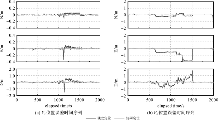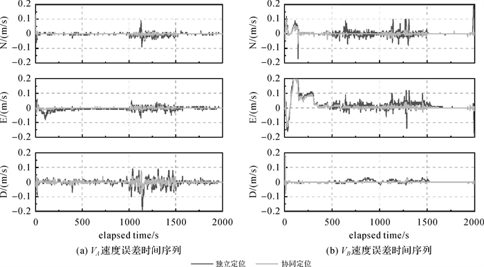 2.2 结果与分析图 5给出了VA和VB在独立模式和协同模式下的位置误差序列,图 6展示了三维位置误差累积分布函数(cumulative distribution function,CDF)。表 2和表 3给出了相应的精度统计结果。图 7和8展示了VA和VB在独立模式和协同模式下的速度与姿态误差序列。