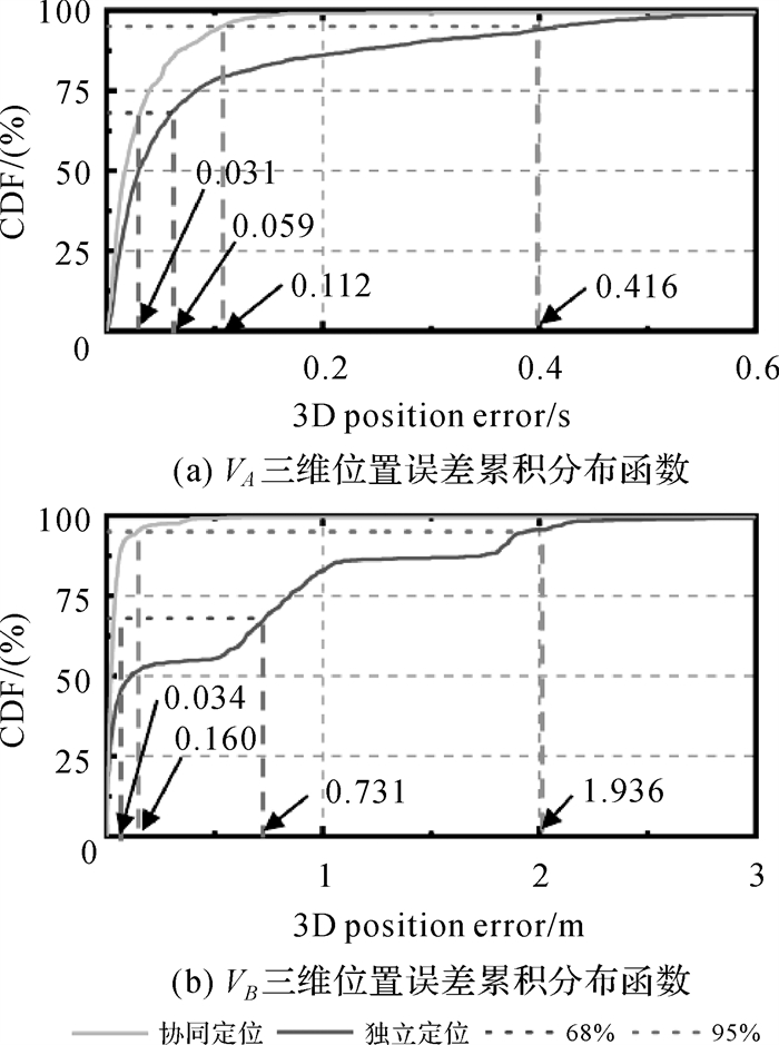 由整体试验结果可知,协同定位的精度显著优于载体独立定位效果,VA和VB独立定位的RMS分别为0.169和0.864 m,协同定位的RMS分别为0.045和0.071 m,精度提升了73.37%和91.78%;VA和VB独立定位68%对应的CDF分别为0.059和0.859 m,协同模式下该指标分别为0.031和0.034 m,提升了47.46%和96.04%;95%对应的CDF分别从0.416、2.792 m提升至0.112、0.160 m,分别得到了73.87%和94.27%的改善。