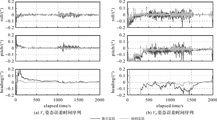本文结合图 7和图 8简要分析协同与独立模式在测速与定姿精度上的差异。当可用GNSS观测值较多时,无论是VA还是VB,协同与独立模式最终都取得了相当的测速与定姿精度。此外,观察VA的T1时段与VB的T4时段,可以发现协同相比于独立模式明显缩短了速度与姿态的收敛时间;当载体在可用GNSS观测值较少的环境中运动并且采用独立模式时,无论是VA还是VB,其速度与姿态精度都会有不同程度的发散,发散的速度取决于IMU器件的精度。而当采用协同定位模式时,VA与VB即使在恶劣环境中也能保持非常高的测速与定姿精度。这说明协同模式不仅可以改善车辆的定位精度,也可以有效改善车辆的测速与定姿精度,并且加快待估参数的收敛速度。