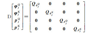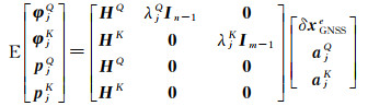 式中,H代表坐标向量的设计矩阵[17];δxGNSSe代表相对于GNSS天线相位中心的坐标改正值;QϕjQ、QϕjK、QpjQ、QpjK分别为双差载波相位和伪距观测值对应的方差-协方差矩阵,本文采用文献[24]的信号载噪比定权。