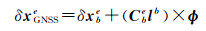 联合式(5)、式(9)和式(12),并顾及GNSS和INS对误差定义相反[13, 15],得GNSS/INS紧组合的观测方程为