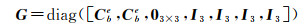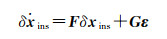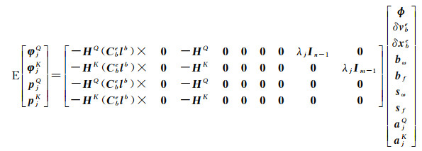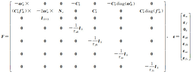 式中,τωb、τfb、τωs、τfs和εωb、εfb、εωs、εfs分别表示相应变量的相关时间和驱动白噪声,其数值由IMU自身性能决定。至此,INS的待估参数向量为δxins= [ϕ, δ vbe, δxbe, bω, bf, sω, sf]T,其时间更新方程为