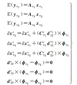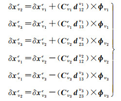 假设事先采用某种方式确定了载体V1、V2、V3之间的相对空间关系d12、d13、d23(可通过GNSS相对定位、视觉/激光雷达匹配等技术得到),以GNSS相对定位为例,此时可以直接得到e系下两辆车之间的相对空间距离de= Cvedv,其中v代表车辆坐标系,Cve可从组合导航程序得到。注意,下文讨论均以载体的IMU中心为坐标参考点,且IMU安装时与车辆的轴向严格对齐。根据式(12),可以得到
