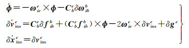 式中,f、g、v和x分别表示比力测量值、重力及IMU中心点的速度和位置;(×)代表两个向量间的叉乘算子或单个向量的反对称阵算子[14];(·)为微分算子;Cbe代表从b系到e系的转换矩阵。其他变量的上标表示投影坐标系,下标表示参考坐标系或目标坐标系。以ωebe为例,上下标表示b系相对于e系的旋转角速度向量在e系中的投影[3]。由于初始状态和IMU观测值存在误差,以及重力存在偏差,导致INS递推算法的误差随着时间快速累积。限于篇幅原因,直接给出e系下INS误差方程[4, 14-15]