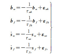 式中,bω、bf、sω、sf、εω和εf分别表示陀螺仪和加表的残余零偏项、比例因子项和量测噪声。由于IMU每次上电后的残余零偏项和比例因子项都不尽相同,因此无法通过先验校正,而需要通过参数估计的方式对其进行补偿。通常对残余零偏项和比例因子项建立一阶马尔可夫过程[4]