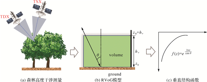 | 图 1 InSAR技术测量森林高度时的RVoG模型 Fig. 1 RVoG model in InSAR measurement of forested area |