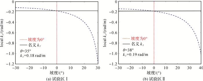 基线配置和局部地形条件决定InSAR系统获取观测数据的干涉质量和测高能力[24]:当基线较长时,测高敏感度较强而相干性损失较多;当基线较短时,相干性能保持较高水平而测高敏感度不足;另外,不同的入射角对地形起伏区域也会使垂直波数kz产生较大偏差[25]。为分析坡度引起的估计偏差,不同坡度引起的局部垂直波数kz变化情况如图 10蓝色虚线所示(红色虚线表示坡度为0,黑色实线表示名义kz的大小)。