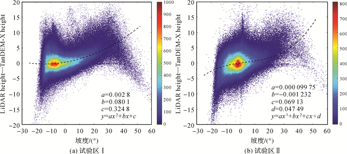 另外,充分利用已有外部辅助LiDAR树高数据(图 8中的红色矩形区域),分析坡度与反演结果偏差的关系,并建立树高与估计偏差之间的回归函数关系(图 12)。由图 12可以看出,两个试验区在正坡区域存在明显的低估趋势;试验区Ⅰ在负坡区域存在离散的高估和低估现象,而试验区Ⅱ在负坡区域存在显著的高估趋势。