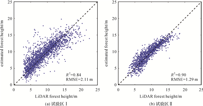 | 图 9 两个试验区的森林高度反演结果与LiDAR森林高度的验证 Fig. 9 Validation of the forest height inversion results vs. LiDAR forest height of two study sites |