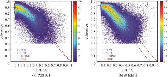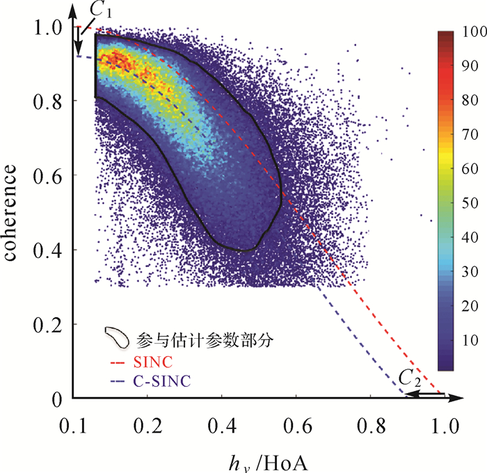 式中,C1和C2是引入的半经验参数,起到调节相干性与树高之间的关系,使得二者更满足函数关系,将相干性与森林高度在像素级别上进行画图,其示意图如图 2所示。图 2中不同颜色代表了点云的密度,颜色由蓝变黄再到红色,说明该平面坐标系内该位置的像素变多。曲线包围部分为参与估计参数的部分,SINC函数模型用红色虚线表示,C-SINC模型用蓝色虚线表示。另外,为避免不同基线引起的差异,在估计参数时采用hv/HoA作为自变量进行归一化。当配置了合适的半经验参数时,C1和C2具有明确的物理意义。首先,由式(5)可知,当裸露的地面上不存在树高时,InSAR观测相干性应为1。然而在包括系统去相干因子γsystem等未补偿的残余去相干影响下|γv|小于1,因此增加半经验参数C1补偿残余失相干因子。C1值的大小在图 2纵轴上表现为由相干性为1处向下移动,一般位于0.9~1之间。C2被认为进一步调节相干性与树高的关系以贴合点云密度较大的趋势,使得反演结果误差更小。如使用较长或较短的基线获取观测数据时,因测高敏感度存在差异而导致SINC函数模型无法准确描述相干性与树高之间的关系,借助C2可纠正不同的基线配置、森林类型或随机噪声等非主导因素导致的模型匹配误差。C2值的大小在图 2横轴上表现为在hv/HoA为1处左右浮动,一般位于0.8~1.5之间。此时,借助C1和C2的共同调节,相较于SINC函数模型,C-SINC模型能较好地描述两者的关系。