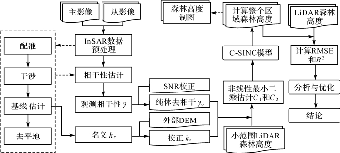 | 图 3 少量LiDAR数据辅助的TanDEM-X InSAR相干性森林高度反演流程 Fig. 3 Flowchart of forest height inversion with TanDEM-X InSAR coherence aided a subset of LiDAR data |