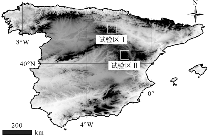 本文选取位于西班牙境内的两个试验区,试验区为典型的地中海气候,位置如图 4所示。两个试验区内森林高度相对较低,主要集中在3~20 m之间,其LiDAR树高分布如图 5所示。另外,森林覆盖区域地形起伏较大,主要山脉沿东西走向,其中试验区Ⅰ的地形条件较为复杂,海拔高度变化集中在500~2000 m之间;试验区Ⅱ相对平坦,海拔高度主要集中在1200~2000 m之间,试验区的坡度统计如图 6所示。