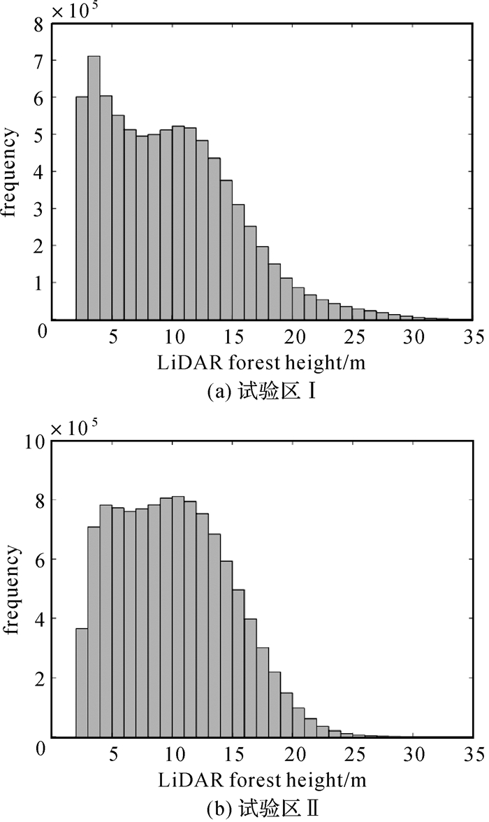 | 图 5 试验区内LiDAR森林高度分布直方图 Fig. 5 Histogram of LiDAR forest height in the study sites |