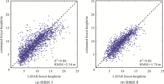 由图 8可看出,在视觉效果上两个试验区的反演结果和LiDAR树高的形态特征总体上吻合较好,但都出现了高植被区被低估的现象,主要原因为图 8(a)中的C-SINC模型曲线在高植被区偏离了点云集中区域,其点云分布在高于HoA/2部分较为发散,经过最小二乘非线性约束得到的参数不能较好地表征所有像素的映射关系。为对反演结果进行定量分析,利用已有LiDAR数据进行验证与统计,计算得到的森林高度与LiDAR森林高度在样地水平下的均方根误差(root mean square error, RMSE)和相关系数R2如图 9所示。由图 9可以看出,两个试验区的RMSE为2.34 m和1.74 m,R2为0.80和0.82,从统计散点图的分布和两个统计指标来看,试验区Ⅰ的反演结果较差,其结果在低植被区存在明显的低估;试验区Ⅱ的反演结果相对较好,散点统计图较为收敛,相关性也较高。这是由于两方面因素影响:①由图 5可以看出,试验区Ⅱ内高植被覆盖较试验区Ⅰ较多,在图 7(b)点云中高植被覆盖较多,而随着森林高度的增加,电磁波与森林的相互作用过程变得更为复杂,相干性的不确定性增加,因此在图 7中试验区Ⅱ的点云图相对离散;②试验区Ⅰ的地形起伏较复杂,而在选取小范围LiDAR数据估计半经验参数时,为确保半经验参数的稳健型,在参数估计时仅使用了坡度较小的像素,估计得到半经验参数建立C-SINC模型后,用于反演所有坡度下的森林高度。因此,在反演所有坡度下的森林区域时,试验区Ⅰ的结果统计更分散,试验区Ⅱ因坡度相对较小反演结果更好,相关性更高。