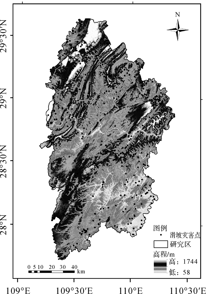 1 研究区概况及数据源 1.1 研究区概况湘西土家族苗族自治州位于湖南省西北部,坐标为109°10′E—110°22.5′E,27°44.5′N—29°38′N,地处武陵山区与云贵高原过渡带,山间有小型盆地和沿河谷地(图 1)。武陵山主脉绵亘中部,呈东北—西南走向,东南部属沅江河谷低山丘陵区,沅江支流武水、酉水为主要河流。全州总面积为15 462 km2[24]。地势由西北向东南倾斜,平均海拨800~1200 m,东西部为低山丘陵区,平均海拔200~500 m,溪河纵横其间,两岸多冲积平原。地貌形态的总体轮廓以山原山地为主,兼有丘陵和小平原,并向西北突出弧形山区地貌。年降雨量1300~1500 mm,雨量集中在春、夏两季。湘西州地质灾害类型以滑坡为主,其次为崩塌、泥石流、地面塌陷等地质灾害,灾害规模均以中小型为主,主要分布于降雨强度大及人类工程活动强烈的区域,其中,暴雨期间仍是地质灾害的高发频发期。