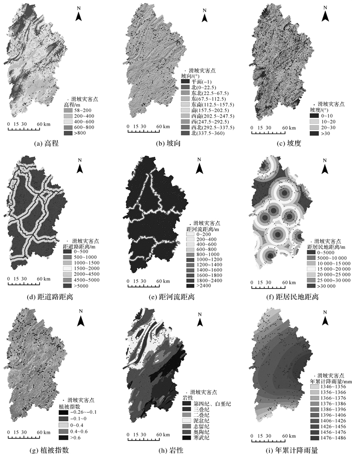 1.3 指标因子选取根据研究区实际情况以及对影响滑坡灾害发生的地形地貌、地层岩性、地质构造、降雨、地表水及人为因素进行分析[24-29],选取了高程、坡度、坡向、地层岩性、植被覆盖指数(NDVI)、年累计降雨量、距道路距离、距河流距离及距居民点距离9个评价因子,如图 2所示。利用逐步回归法对所选特征因子进行多重共线性检验,通过容忍度(T)和方差膨胀因子(VIF)检验各个特征因子之间的相关性。结果显示,所选特征因子T均大于0.1,且VIF均小于10,说明各个因子共线性程度低,具有较好的独立性。