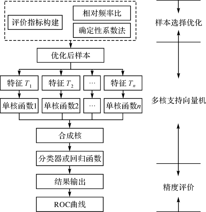 本文提出顾及样本优化选择的MKSVM的滑坡灾害易发性评价方法,通过确定性系数进行样本选择,在训练样本数据集基础上采用MKSVM方法对滑坡灾害易发性模型进行训练与建模,进而实现研究区滑坡灾害易发性评价。技术流程如图 3所示。