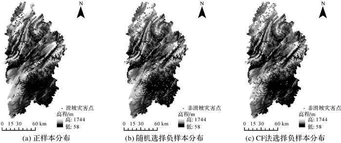 3.1.2 样本选择结果正样本(滑坡灾害点)数据如图 5(a)所示,随机选择负样本(非滑坡灾害点)空间分布如图 5(b)所示,CF法选择负样本空间分布如图 5(c)所示。结合图 6负样本在各类高程中数量可以看出,随机选择负样本方法获取的样本不受高程影响,在空间中分布较为均匀;CF法选择的负样本数量在400~600 m、大于800 m的高程区域明显高于随机选择方法,选取的样本具有较强的稳健性。