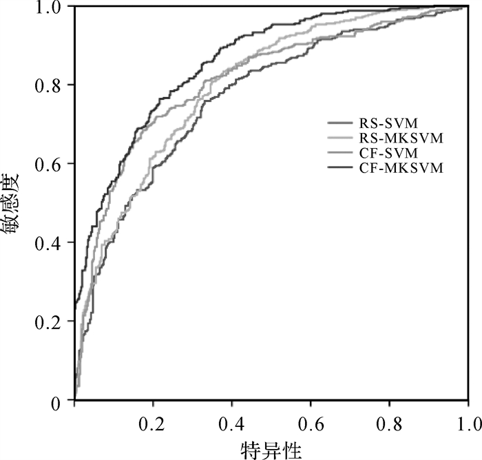 为评估本文方法和单核SVM模型的预测精度,本文采用受试者工作特征(receiver operating characteristic, ROC)曲线进行验证[39],它实际上反映了特异性与灵敏度的关系,是真阳性率与假阳性率的关系图。其背后的逻辑是,如果一项测试没有诊断能力,那么它产生真阳性或假阳性的可能性是相同的。随着诊断能力的增加,即特异性的提升,真阳性率上升,假阳性下降。ROC曲线下的面积(area under curve,AUC)大小代表评价模型精度的大小,面积值越接近1表示评价模型的预测效果越好,面积值等于0.5时无应用价值。4种模型的ROC曲线与AUC值如图 8与表 3所示。