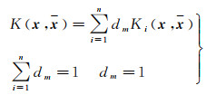 式中,n为基核函数的个数;Kn为基核函数。常用的核函数有线性核函数、多项式核函数、Sigmoid核函数和高斯核函数,本文采用多个RBF核函数作为基核函数。