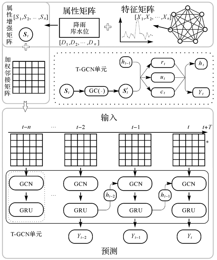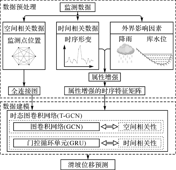 1 基于深度学习的滑坡位移时空预测模型由于滑坡位移变化具有时空相关性,应将其作为时空预测任务。本文提出了一种基于深度学习的滑坡位移时空预测模型,该模型由可捕获监测点间空间相关性的图卷积网络GCN,及获取监测点上位移数据时间相关性的门控循环单元GRU两个模块组成。流程如图 1所示:首先,滑坡位移监测数据通过预处理得到时间相关和空间相关的数据;其次,将外界影响因素作为滑坡监测点属性信息,结合滑坡位移时序特征建模获得增广特征向量,即为属性增强的时间相关数据;最后,利用预处理后的时空图结构数据,采用T-GCN模型实现滑坡位移的预测。