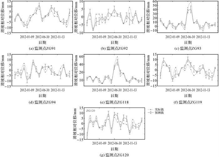 白水河滑坡的7个监测点结果,如图 13所示,每个监测点的预测值与实际值变化趋势一致,非预警区内监测点的误差均控制在10 mm之内,而预警区内监测点主要在突变处出现较大的误差,最大误差为16.66 mm。