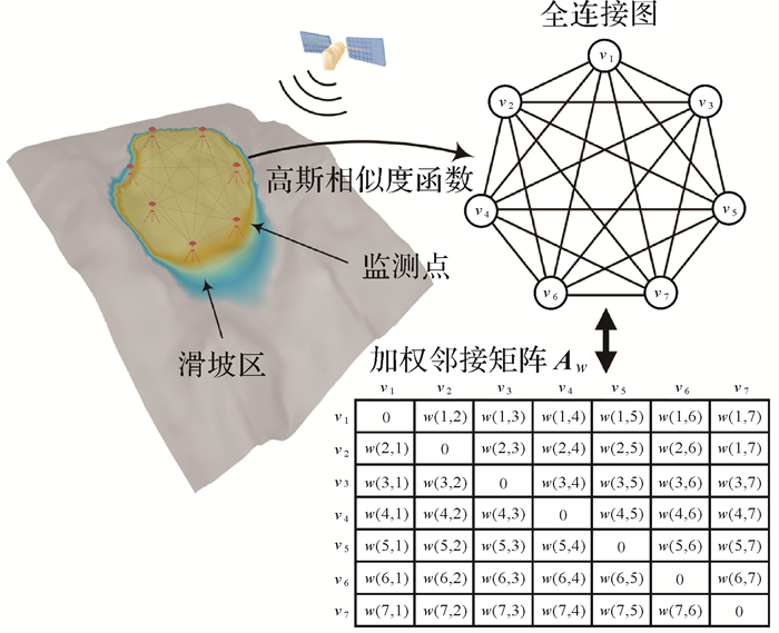 如图 2所示,为表征监测点之间的空间相关性,定义一个加权无向全连接图G =(V, E, W)。其中,V ={v1, v2, …, vN}为图的节点(GNSS位移监测点),N为监测点个数,每对监测点具有一条连接边,连接边E的总数为N×(N-1)/2。W ∈ RN×N表示监测点间相关性的邻接矩阵。