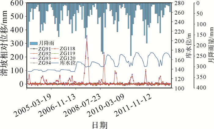 白水河滑坡隶属湖北省宜昌市秭归县,距三峡大坝56 km,为三峡库区中典型的松散堆积层滑坡。滑坡总体坡度约为30°,平均厚度约为30 m,体积约为1260×104 m3;滑面为残坡积层与基岩接触带,厚约0.9~3.1 m,基岩岩性为中厚层砂岩夹薄层泥岩,产状15°∠36°,岩层中节理裂隙发育;滑体物质主要由第四系残坡积碎石土组成,碎石含量20%~40%[28]。根据白水河滑坡的变形特征、观测通视情况,确定监测内容以地表位移监测为主。白水河滑坡点监测点分布如图 5所示,监测初期在3个纵向剖面上共布置7个GNSS监测点(ZG91、ZG92、ZG93、ZG94、ZG118、ZG119和ZG120)。2005年5月之后,在预警区内增设了4个GNSS监测点(XD-01、XD-02、XD-03和XD-04)。顾及监测数据的长时序特征,本文仅采用初期布设的7个GNSS监测点的位移监测数据,构建高斯相似度函数表征空间相关性。所用时序数据范围为2003年7月—2013年3月,滑坡GNSS月相对位移监测数据,三峡库区的同步库水位及当地降雨量数据(图 6)。