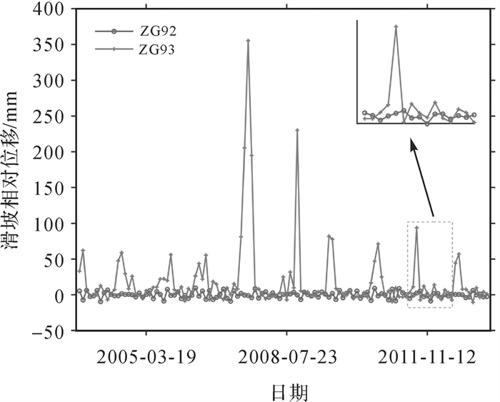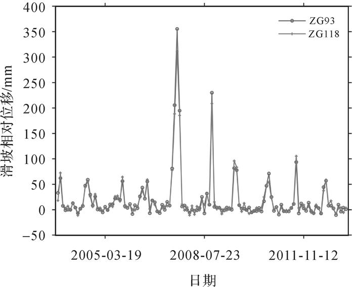 2.2 空间相关性和影响因素分析 2.2.1 空间相关性引入灰色关联度评估监测点之间的空间关联性,若灰色关联度>0.6,可认为两者密切相关[24]。以预警区内相邻的两点ZG93和ZG118为例,其灰色相关度计算结果为0.74,如图 7所示,两者位移变化趋势基本一致,表明两者之间具有很强的空间相关性。而由图 6和表 1可知,预警区外的监测点位移变化趋势较小,大都在20 mm内上下波动,且变化趋势也基本一致。同时,预警区外监测点之间灰色关联度均在0.6以上,且距离越近,灰色关联度越大。因此,预警区外的监测点之间同样具有强空间相关性。结合图 8分析,由于受距离的影响,ZG92和ZG93在局部变化趋势上具有相似性,且灰色关联度为0.54,故预警区内外的监测点同样具有相关性。综上所述,整个监测网中监测点间具有不同强度的空间相关性,并证实了滑坡位移预测需要考虑到监测点间的空间关系,这是不可忽略的重要因素。
