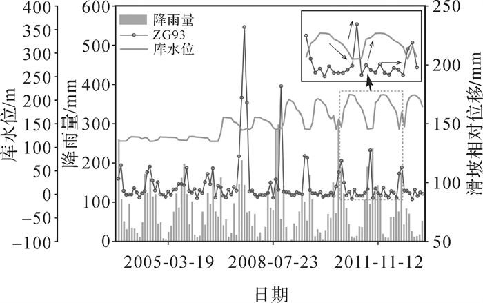 | 图 6 滑坡相对位移-降雨量-库水位关系 Fig. 6 Relationship between landslide relative displacement rainfall reservoir water level |