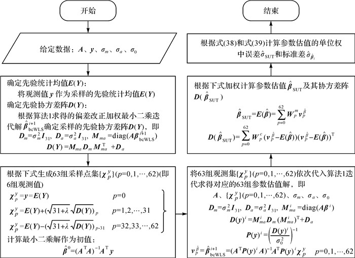 2 加乘性混合误差模型精度评定的SUT法由算法1可以看出,偏差改正加权最小二乘迭代解法中每次迭代的参数估值与观测值的函数关系相同,因此在经过第i次迭代后,最终得到的参数估值的迭代过程可以表示为