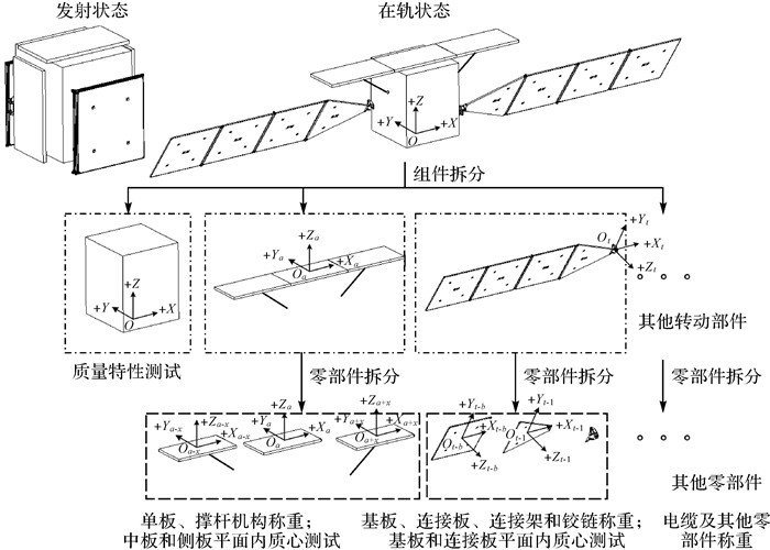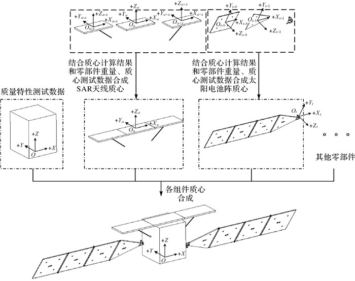 2 基于误差修正的质心估算方法 2.1 计算原理该方法主要对4个主要的误差项进行修正,即部件重量误差、部件质心误差、部件装配精度误差和部件热变形误差。首先,针对部件重量误差和部件质心误差,根据卫星在轨飞行状态的构型,将卫星拆分为星体、可展开天线、太阳电池阵和其他部组件,对星体可以采用地面测试设备准确测出星体的质心并进行记录。将可展开天线、太阳电池阵和其他部组件再次进行拆分,拆分为单板、撑杆机构、铰链、基板等部件,分别对拆分后的部件进行称重,并测量可展开天线的天线板和太阳电池阵的基板等板式部件的质心,如图 1所示。在获取以上实际测得的重量和质心数据后,首先结合理论计算的部组件模型,采用实测数据对理论模型中的铰链、撑杆机构和基板等部组件的理论数据进行误差修正,然后分别计算获取误差修正后各部组件的质心,最后将修正后的部组件质心数据与实际测试的星体质心结果进行数据合成,即可获取卫星理论在轨飞行状态下的卫星质心,如图 2所示。