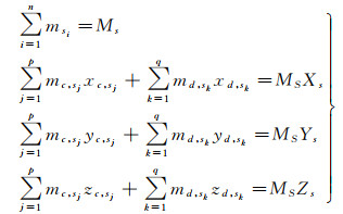 2.2 数学模型根据上述计算原理,对上述质心修正模型进行数学建模和理论分析。设所测部件S的质量为Ms,其中零部件的质量为msi,i=1, 2, …, n, 实测零部件的质心在全局坐标系O-XYZ中的坐标依次为(xc, sj, yc, sj, zc, sj), j=1, 2, …, p, 可计算求得的零部件的质心在全局坐标系O-XYZ中的坐标依次为(xd, sk, xd, sk, zd, sk), k=1, 2, …, q, p+q=n,则该部件的零部件质量和质心(Xs, Ys, Zs)满足的数学方程为