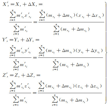 式中,根据部件中零部件的测量结果对上述方程中的质量和质心坐标参数进行修正,修正值为(Δmsi, Δxsi, Δysi, Δzsi),修正后的质心坐标为(X′s, Y′s, Z′s),满足的数学方程如式(2)所示
