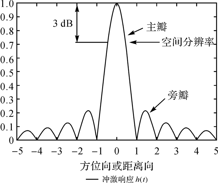 1.1 基于点目标的客观评价指标基于点目标的评估指标主要包括空间分辨率、峰值旁瓣比、积分旁瓣比和相对辐射精度。以上参数的理论值均可通过计算和分析SAR图像中点目标的冲激响应函数(impulse response function, IRF)得到,点目标冲激响应函数h(t)如图 1所示。