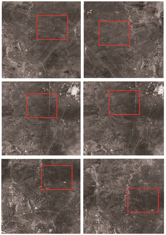 试验数据选择天绘二号01组卫星的A星和B星降轨时图像。卫星运行的轨道高度为500 km,1景图像幅宽为30 km,尺寸大小为10 000×10 000像素,图像分辨率为3 m,分别选择A星、B星于2019年5月26日18时25分、5月28日17时46分、6月8日19时35分3个不同时相经过内蒙古定标场的6组数据,截取大小为1000×1000像素且包含均匀区域的图像(图 2)进行了图像质量评价和指标验证。其中基于点目标的评价参数进行计算时,截取了该图范围内10个角反射器所在位置为点目标,图 3对天绘二号A星5月26日的角反射器目标进行了单独陈列,其他的数据形式与此相似,由于篇幅原因不予全部列出。而对基于面目标的评价指标进行计算时,数据则截取原始图像中相对均匀的区域(非同一区域),本文处理部分为图 2所框选的均匀区域。
