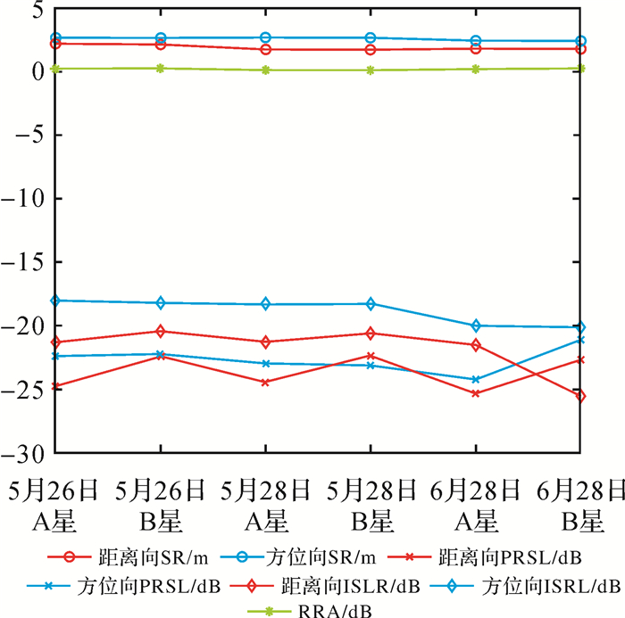 (3) 天绘二号01组A、B星不同时相的点目标客观评价指标如图 5所示。从积分旁瓣比和峰值旁边比来看,距离向的结果优于方位向,即在距离向上,点目标的能量越集中,从雷达图像中检测出暗目标和弱目标的能力越强;从空间分辨率来看,距离向的结果略优于方位向的结果;相对辐射精度维持在相对稳定的水平。