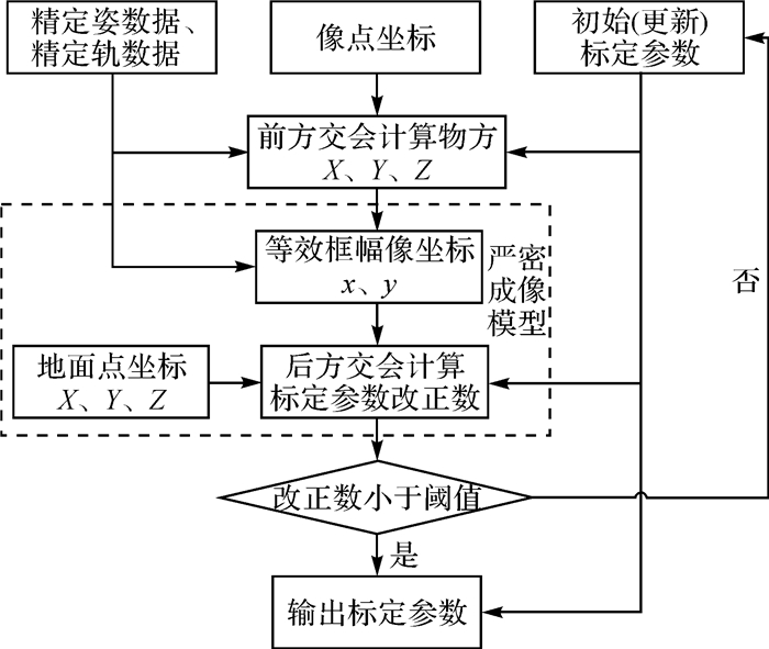 (1) 利用精密定姿数据、精密定轨数据、初始标定参数和像点坐标,通过直接前方交会计算像点对应的物方坐标。